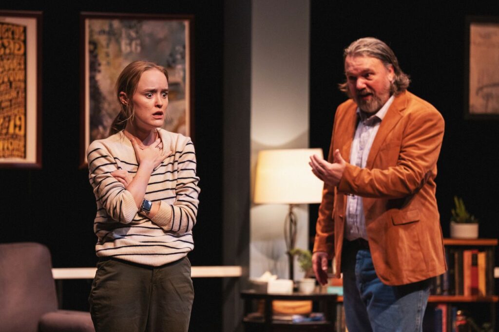 The physical production of JOB is deliberate and highly effective, with each design element enhancing the play’s psychological depth. Scenic designer Brian Watson crafts a space that is both clinical and claustrophobic, resembling a therapist’s office, rendered with such stark precision that it becomes a character in its own right. His design amplifies the feeling of confinement and observation, allowing the tension between Jane and Loyd to simmer in every corner. Madison Booth’s costumes subtly reflect the characters’ emotional states, while Jon Olson’s lighting accentuates the play’s tonal shifts with surgical accuracy. The play features extreme lighting effects that heighten the action. Max Silverman’s original music and sound design create an undercurrent of unease, and Annette Westerby’s carefully chosen props ground the action in tactile realism. Together, the team makes a world that feels both ordinary and ominous—ideally suited for the play’s slow-burning suspense.
